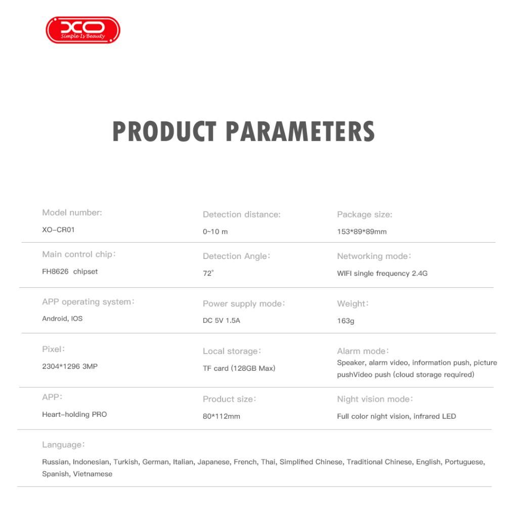 Η κάμερα XO CR01 είναι μια ασύρματη κάμερα που είναι εξοπλισμένη με μια σειρά από λειτουργίες που θα κάνουν το σπίτι σας καλύτερα προστατευμένο και θα σας προσφέρουν ένα βολικό εργαλείο για καθημερινή χρήση. Διαθέτει συνδεσιμότητα WiFi, ρυθμιζόμενες γωνίες θέασης 340° αριστερά/δεξιά και 68,5° πάνω και κάτω.